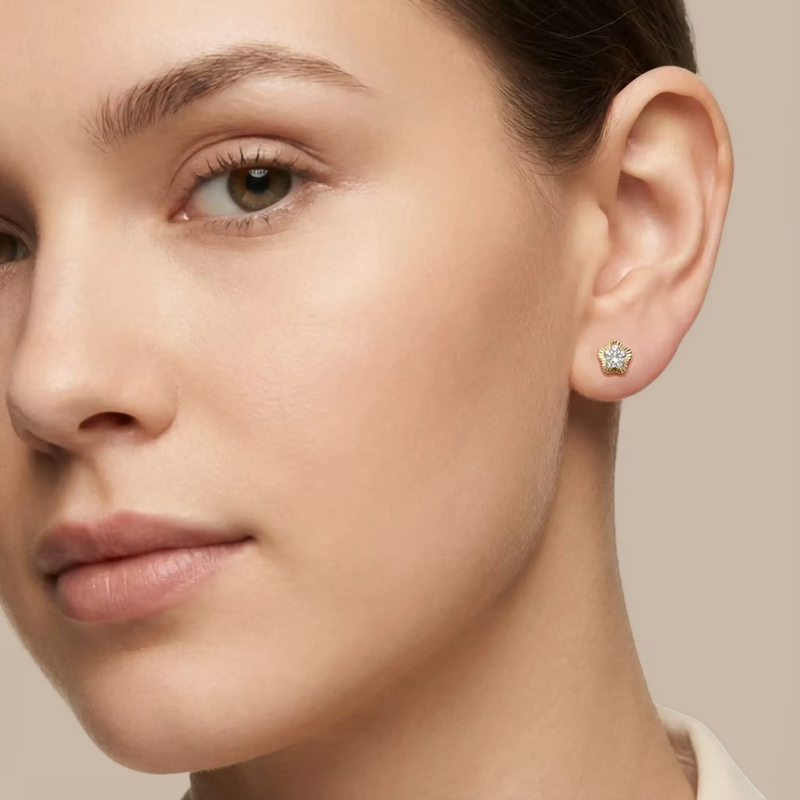 Broquel oro amarillo 10k, modelo Biselado diamantado flor con zirconia redonda de 6mm.